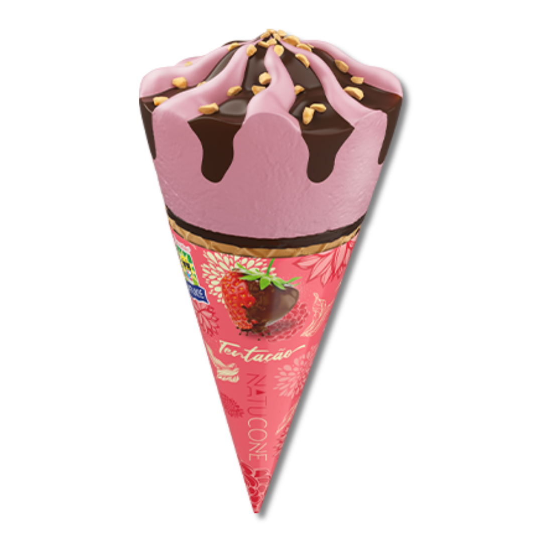 Clássico cone com sorvete de morango, cobertura de chocolate e coberto com amendoim, uma delícia!