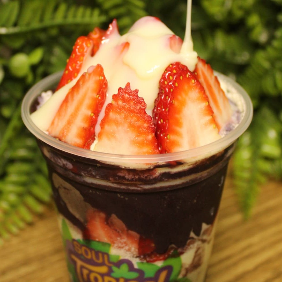 Copo de açaí de 400 ml com morango, leite condensado e leite em pó. Os adicionais são fixos e não podem ser alterados.