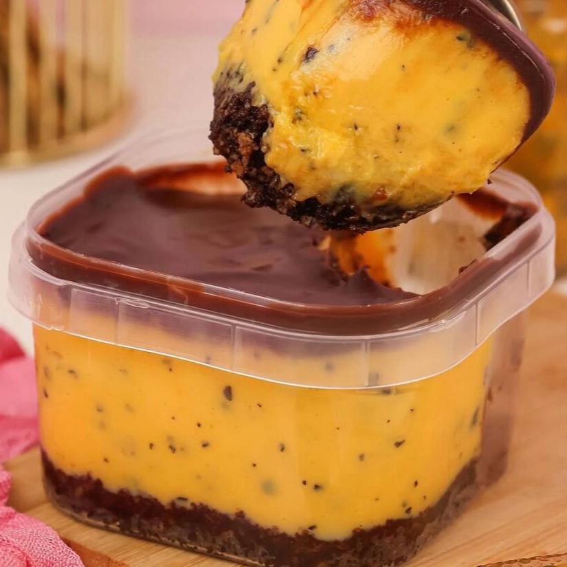 Base de brownie , Mousse de Maracujá e cobertura de Ganache de chocolate .