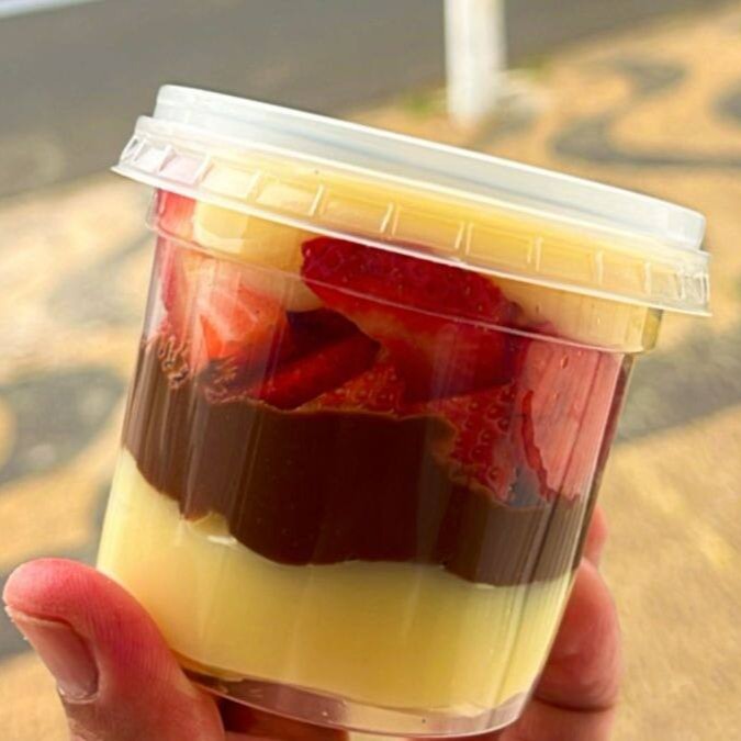 Nossos Copos levam Brownie , e necessario aqueçer por 30 segundo , ja que o mesmo leva chocolate em sua receita , e pode ficar mais durinho por ir a Geladeira.