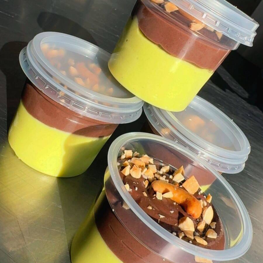mousse levinho de abacate com toque de limão, finalizado com chocolate e castanha de caju