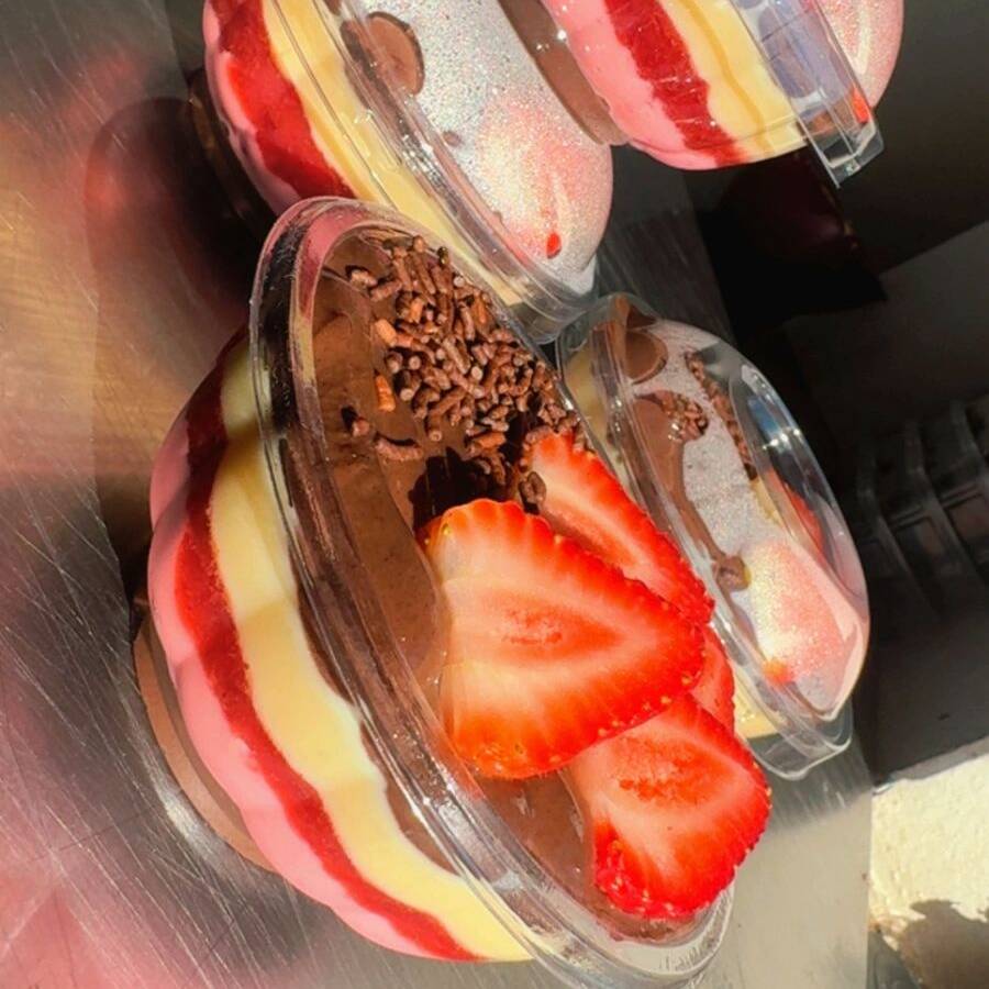 A mais queridinha , creme de chocolate, mousse de morango com geleia de Morango, finalizado com chocolate 50%