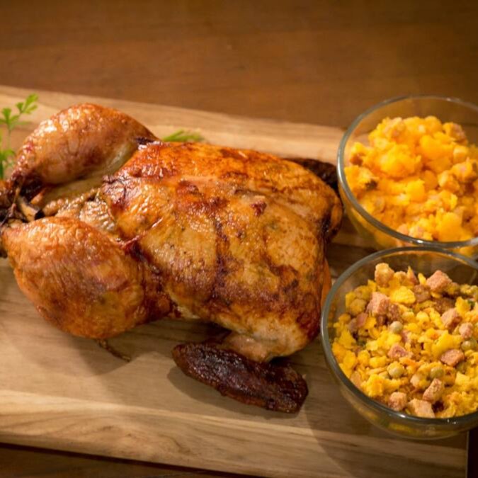 Nosso frango assado recheado especial Recheado com uma incrível combinação de Mandioca e Bacon! Com sabor delicioso e diferenciado, um frango textura macia e suculenta, e aroma irresistível, é uma experiência gastronômica única. Usamos ingredientes frescos e selecionados com cuidado para garantir o melhor sabor. E tudo isso a um preço justo e acessível, experimente nosso frango assado recheado!