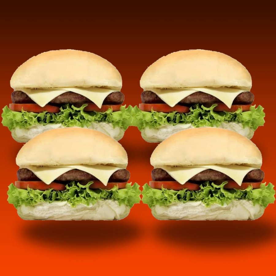 4x Lanches CheeseBurguer, com pão Brioche hambúrguer e mussarela derretida.