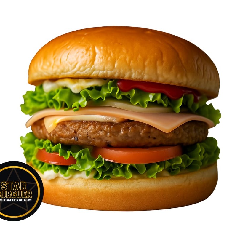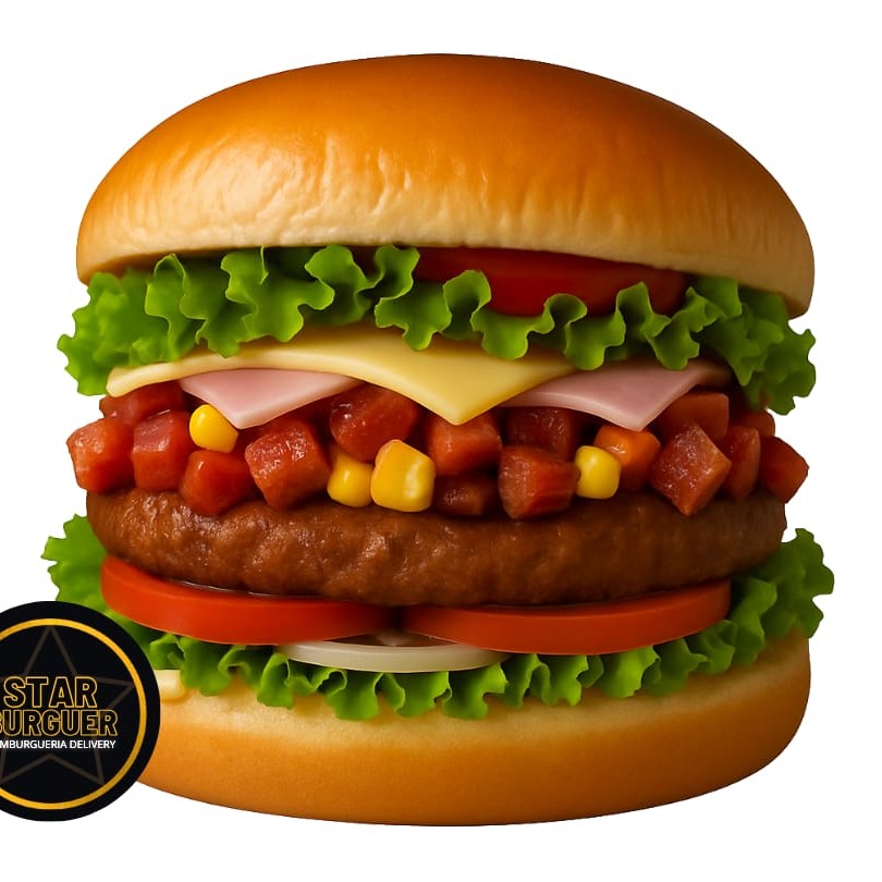 Delicioso pão de 100g, com maionese cremosa, batata palha crocante, hamburguer, presunto e mussarela derretida.