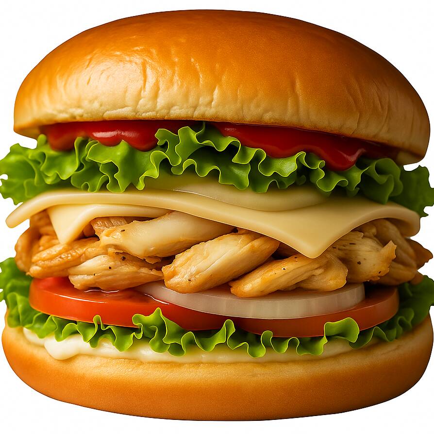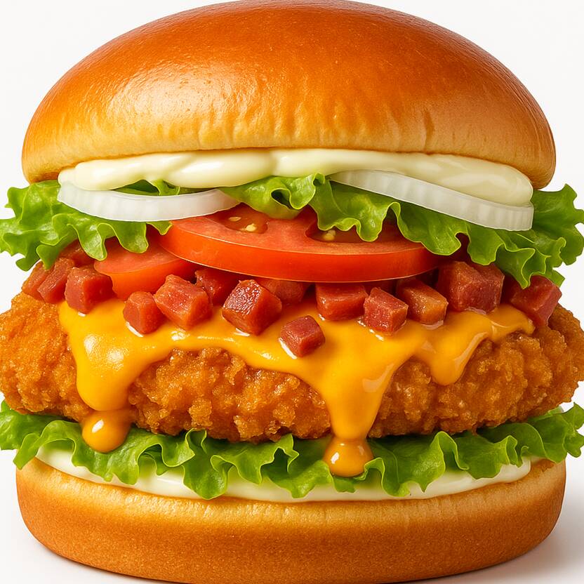 Um suculento filé de frango empanado, dourado e crocante, cuidadosamente acomodado entre um macio pão brioche selado com maionese dos dois lados. Camadas frescas de alface crespa, tomate maduro e cebola frita completam o sabor e o visual irresistível. Uma combinação equilibrada de crocância, cremosidade e frescor que faz desse lanche uma verdadeira estrela do cardápio.