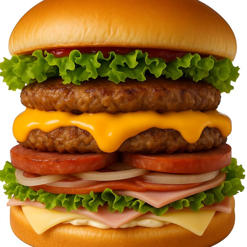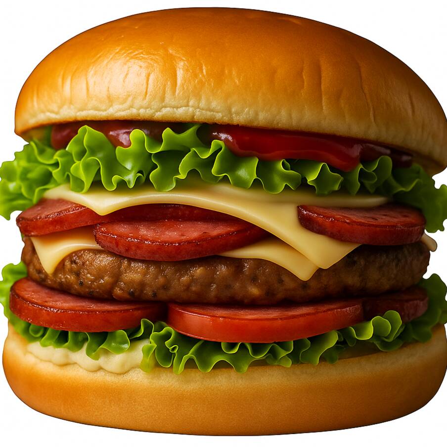 Sabor de verdade e muita generosidade no recheio! Dois hambúrgueres grelhados, dupla camada de cheddar cremoso, calabresa no ponto certo, presunto, queijo, cebola frita, alface crocante e tomate fresquinho — tudo isso num pão macio. É lanche completo, recheado e com muito cheddar. Do jeito que você gosta!