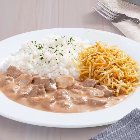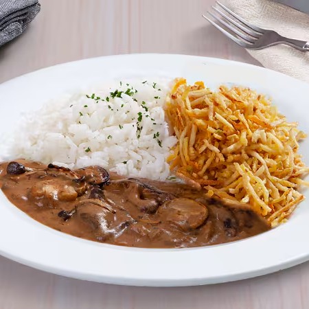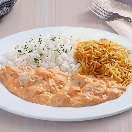 Tiras de peito de frango, fatias de champignon no molho tradicional, acompanha arroz e batata.