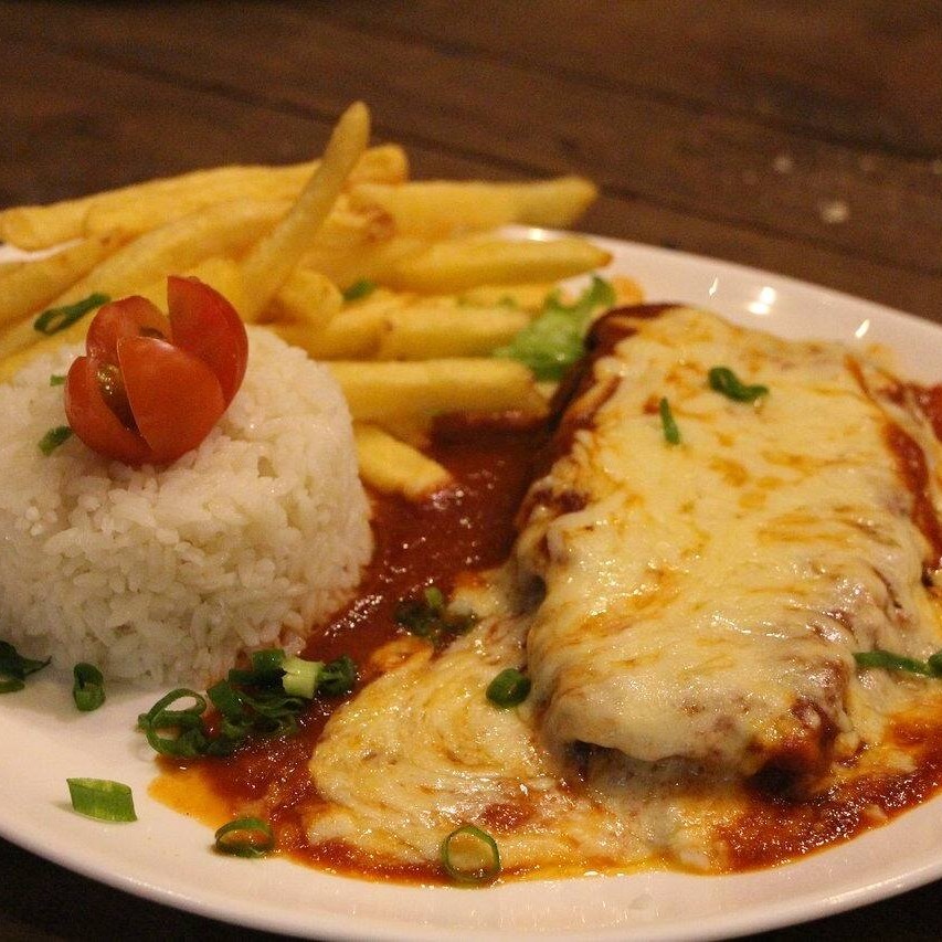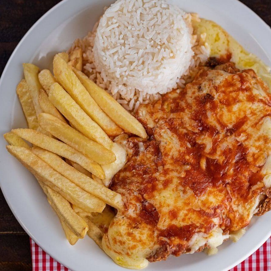 Parmegiana de Carne e Macarrão Talharim Alho e Óleo