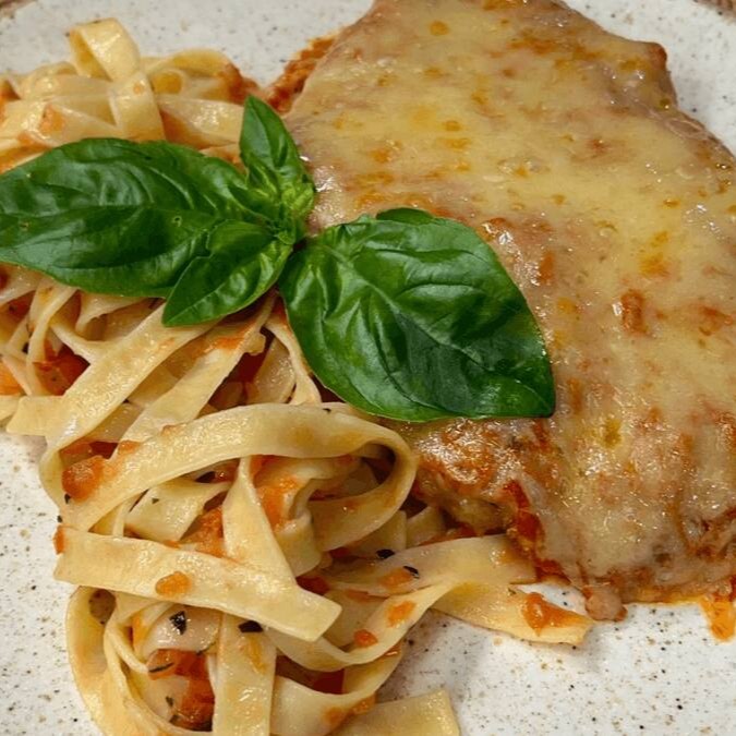 Parmegiana de Frango e Macarrão Talharim Alho e Óleo