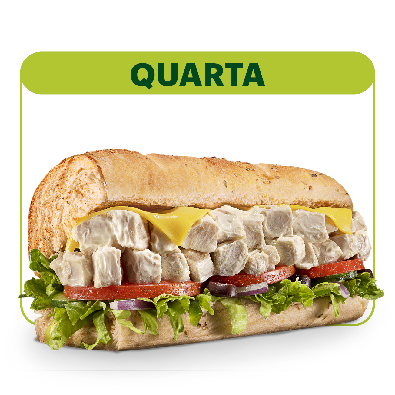 Pão Italiano Branco, Frango Assado em dobro, Mussarela, Alface, Tomate, Cebola Roxa, Pepino, Azeitona, Molho Mostarda e Mel.