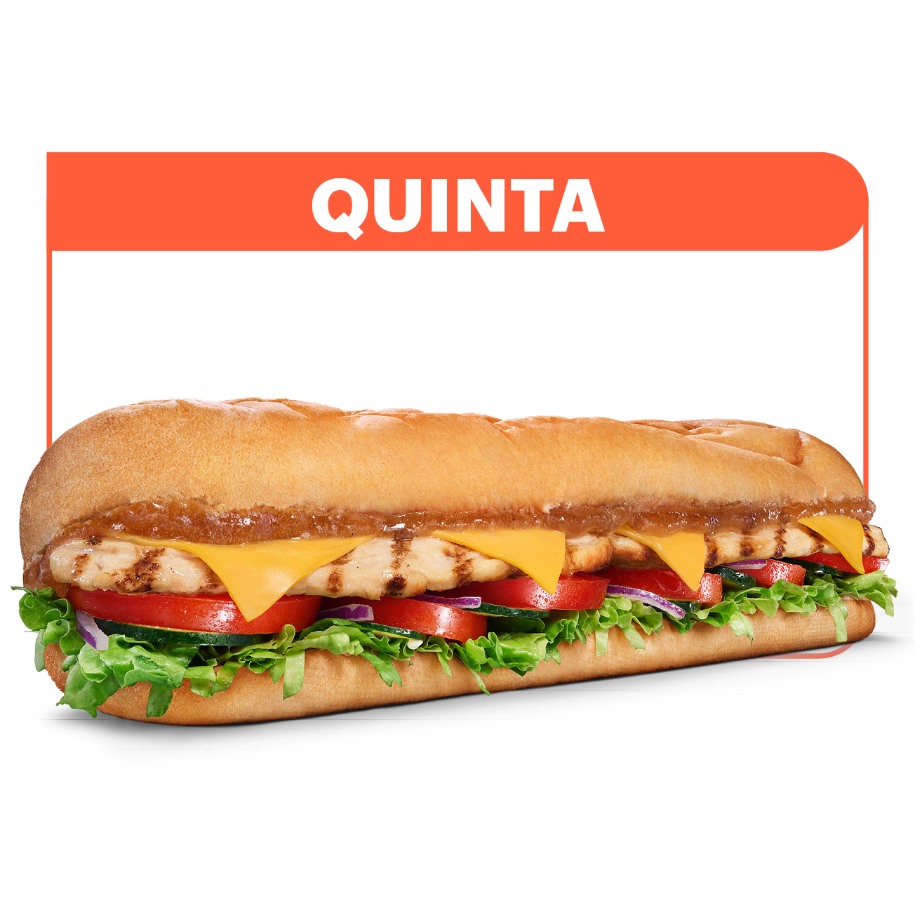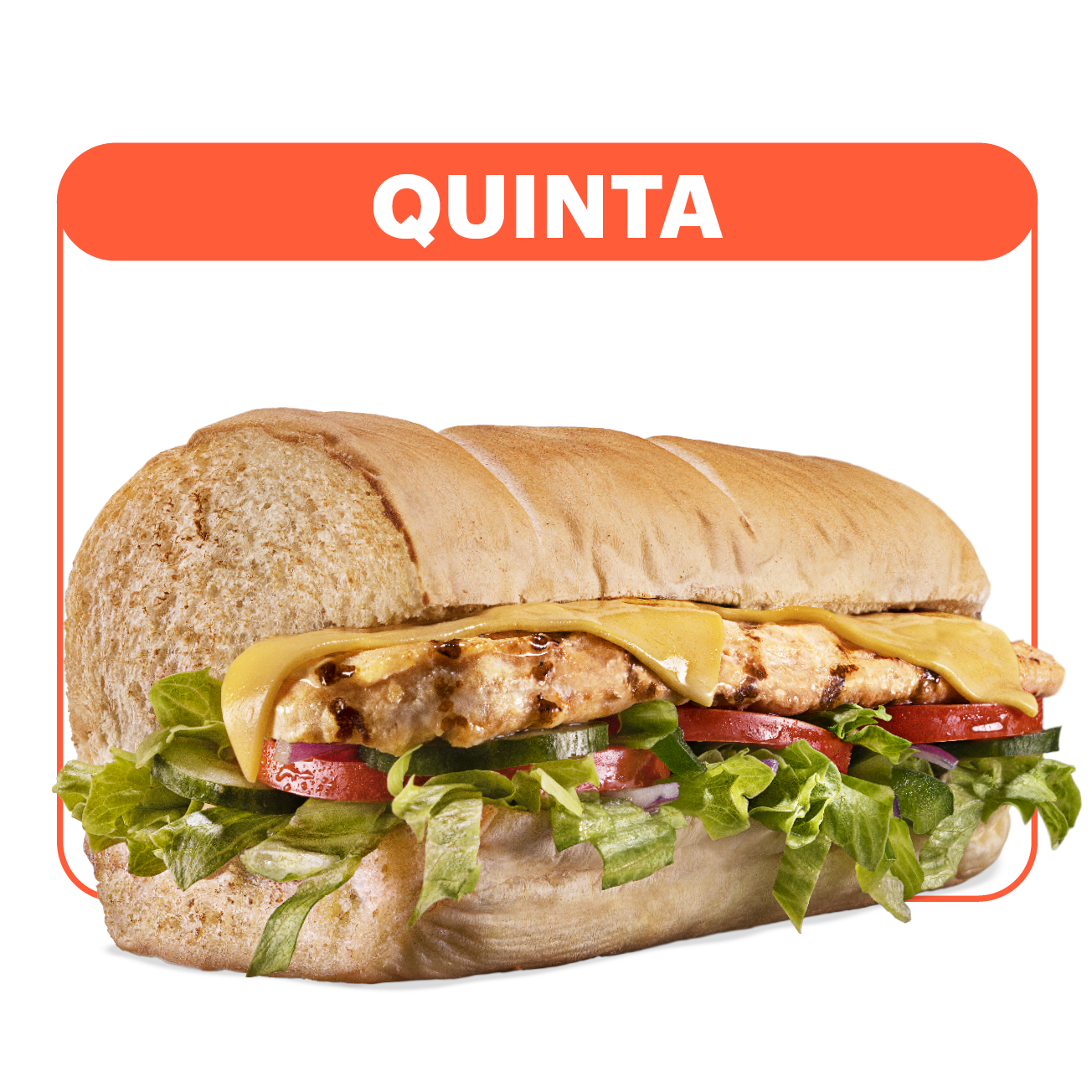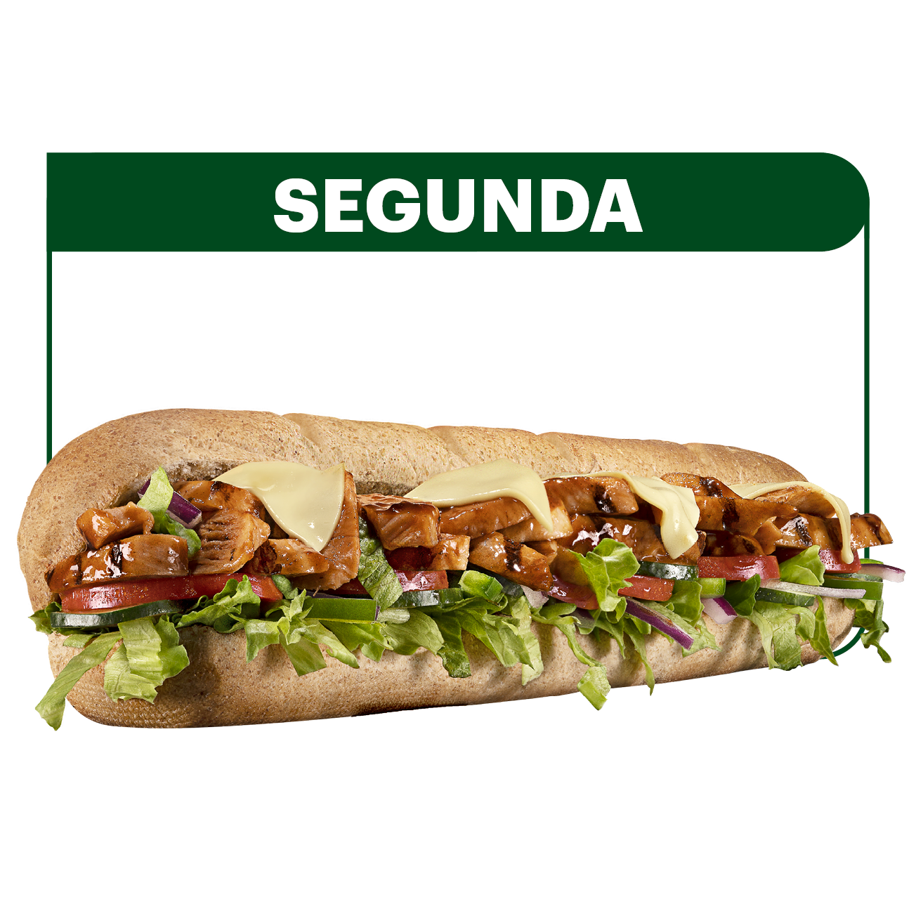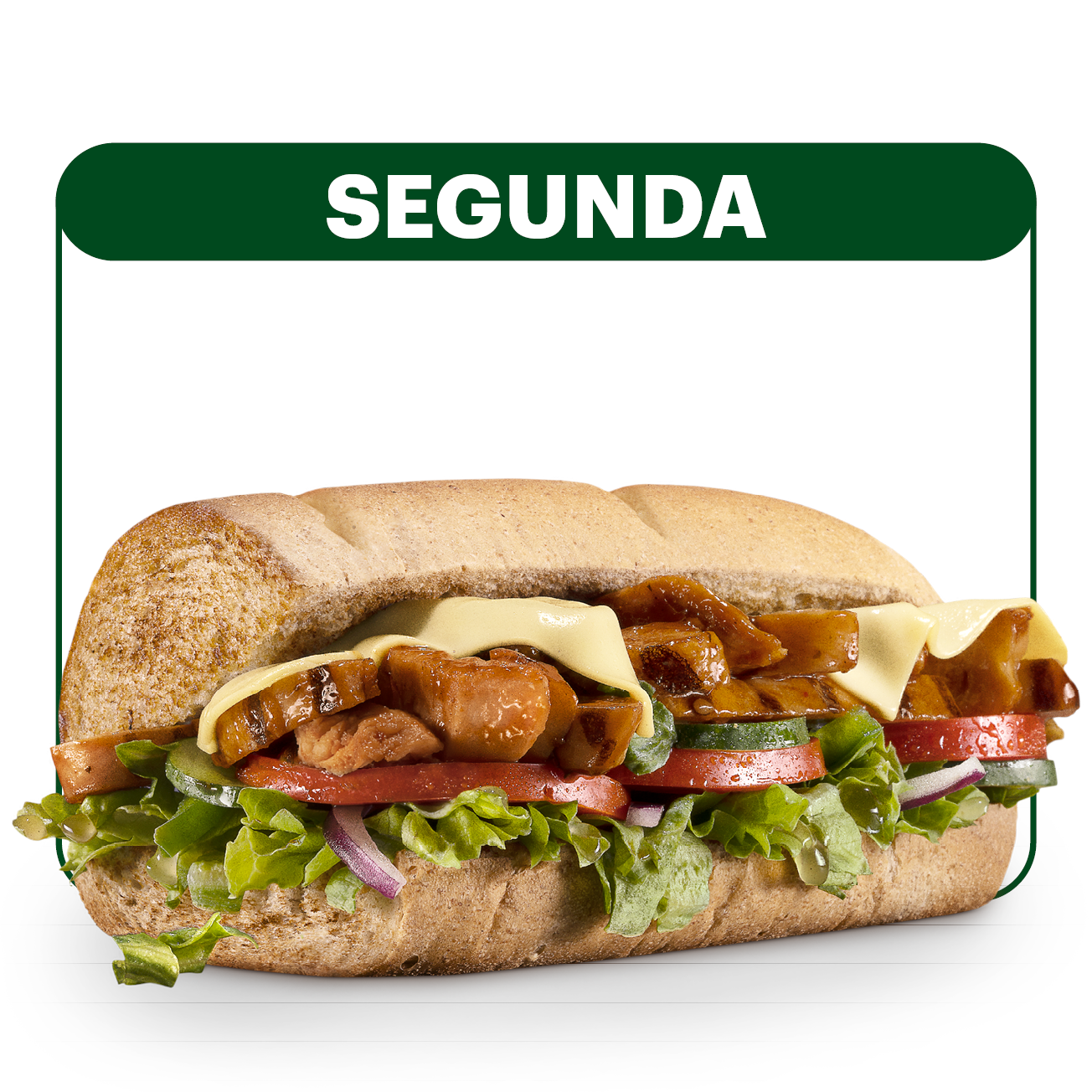 Pão 9 Grãos, Frango Teriyaki em dobro, Mussarela, Alface, Tomate, Cebola Roxa, Molho Cebola Agridoce.