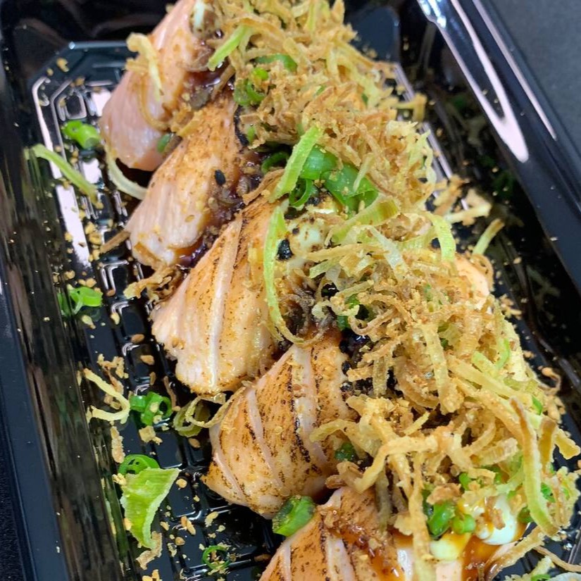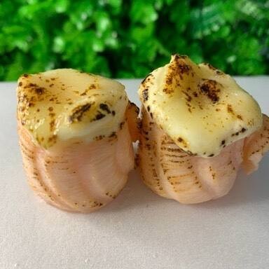 Bolinhos de arroz temperado cobertos com fatias de salmão levemente maçaricadas, realçando o sabor com um toque defumado e textura ainda mais macia.