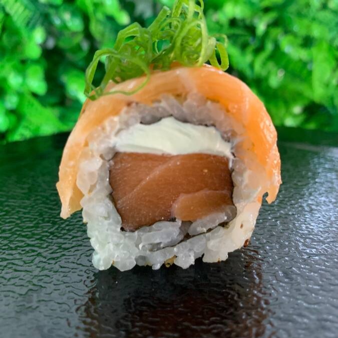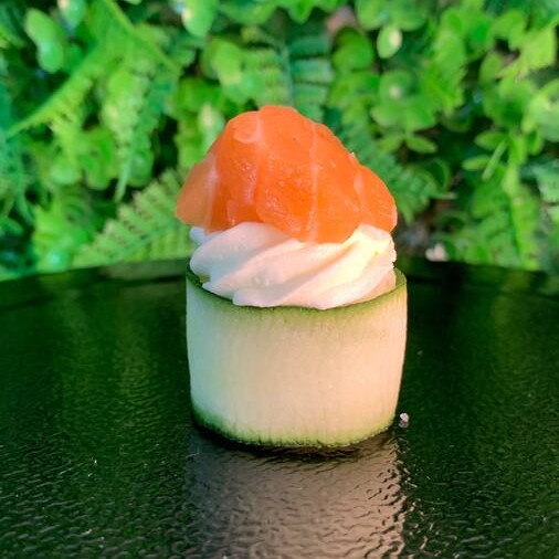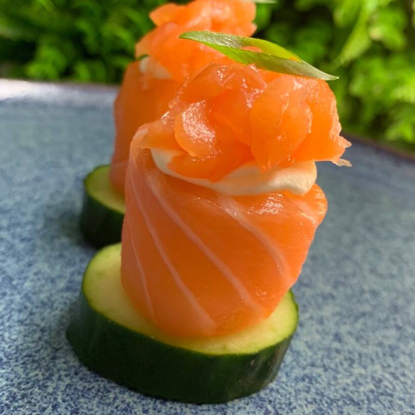 Deliciosos bolinhos de arroz envoltos em finas fatias de pepino japonês, finalizados com uma generosa cobertura de cream cheese e salmão fresco.