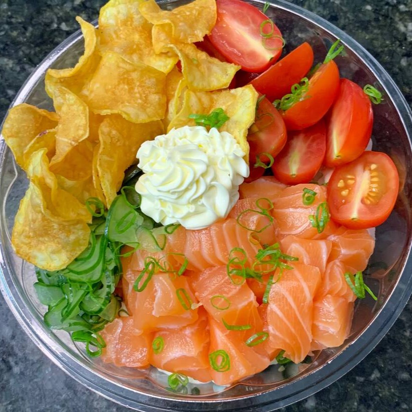 500g salmão ao molho de ostra, chipys de batata doce,tomate cereja,kane,manga,sunomono,arroz, cream chease e cebolinha