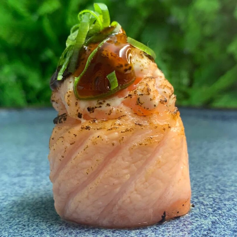 Bolinhos de arroz envoltos em salmão fresco, finalizados com uma combinação de salmão e cream cheese maçaricados.