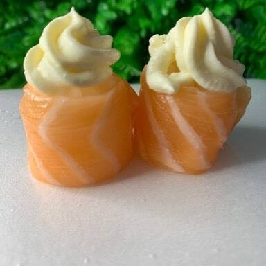 Deliciosos bolinhos de arroz envoltos em fatias de salmão fresco, finalizados com uma cremosa cobertura de cream cheese.