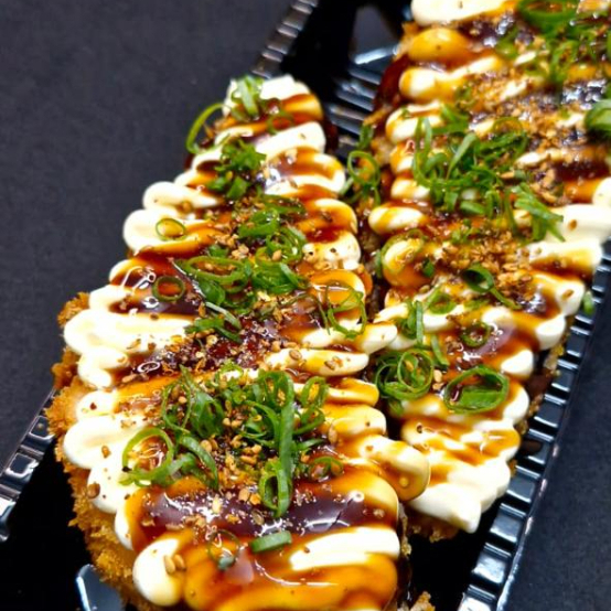 Bolinhos de arroz envoltos em salmão fresco, finalizados com uma irresistível cobertura de cream cheese e gorgonzola levemente maçaricados.