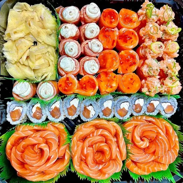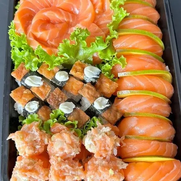 10 sashimi de salmão, 4 niguiris de salmão, 4 jhow, 6 filadélfia salmão, 5 hossomaki salmão, 6 filadélfia salmão skin, 5 niguiris de kani, 10 hot filadélfia, 10 jhow, 10 jhow maçaricado.