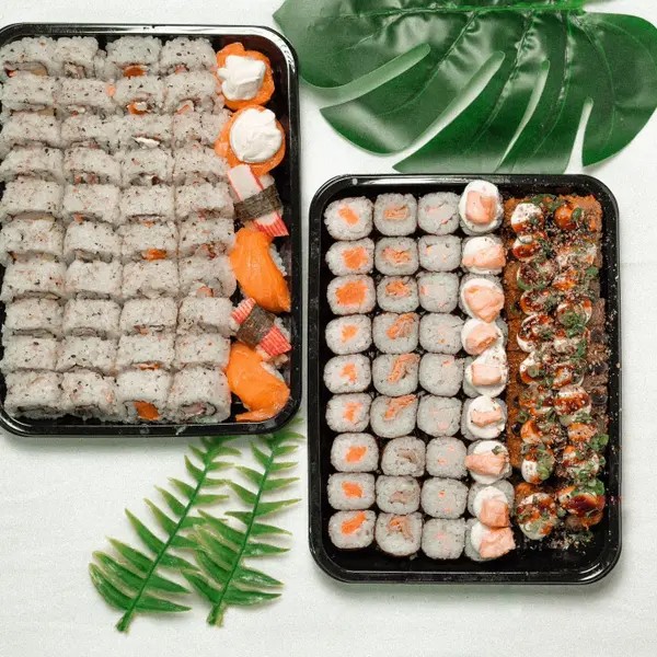 10 unidades de uramaki salmão, 10 unidades de uramaki california, 10 unidades de uramaki skin, 10 unidades de uramaki kani, 09 unidades de hossomaki salmão, 09 unidades de hossomaki skin, 09 unidades de hossomaki kani, 09 unidades de hossomaki pepino com geleia de pimenta, 02 jhow, 02 niguiris de salmão, 02 niguiris de kani, 20 unidades de hot philadélfia salmão.