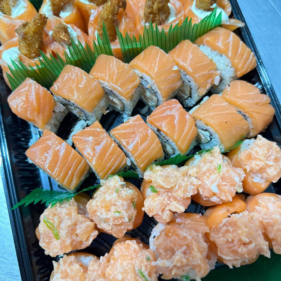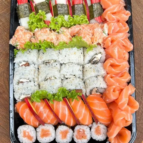10 sashimi de salmão, 5 niguiris de salmão, 5 jhow, 6 filadélfia salmão, 5 hossomaki salmão, 6 filadélfia salmão skin, 5 niguiris de kani, 10 hot filadélfia.