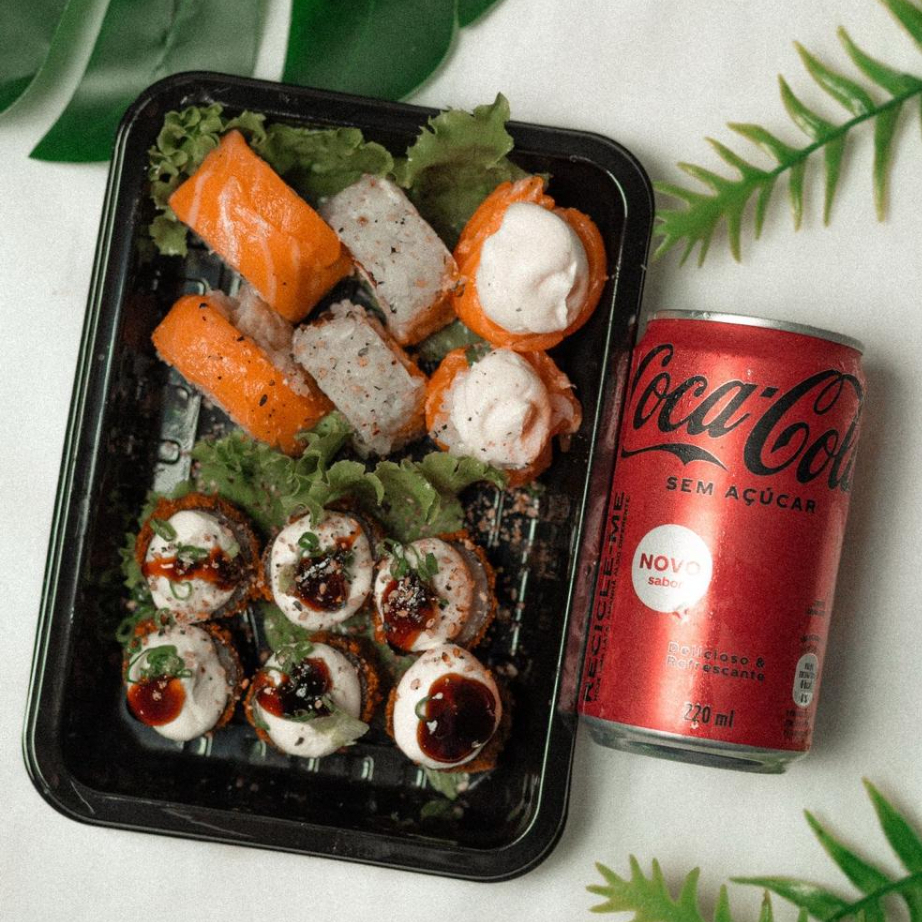 12 peças bem servidas + Coca-Cola 220ml 2 sushis laminados de salmão 2 sushis Philadelphia de salmão 6 hot Philadelphia empanados Coca-Cola 220ml Ideal pra matar a fome gastando pouco!