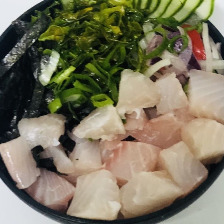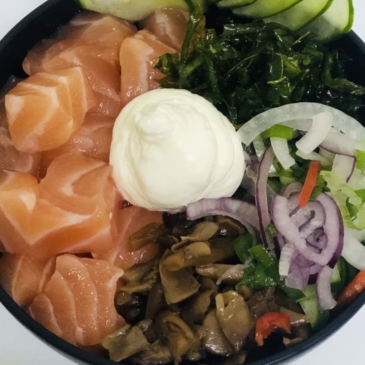 Nosso poke com 100g de proteína (salmão), base arroz japonês com molho ponzu e complementos: couve frita, saladinha, shimeji e cream cheese *** Não Fazemos Alteração ***