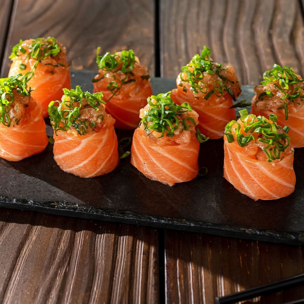 8 fatias de salmão enrolado no cream cheese e maçaricado.