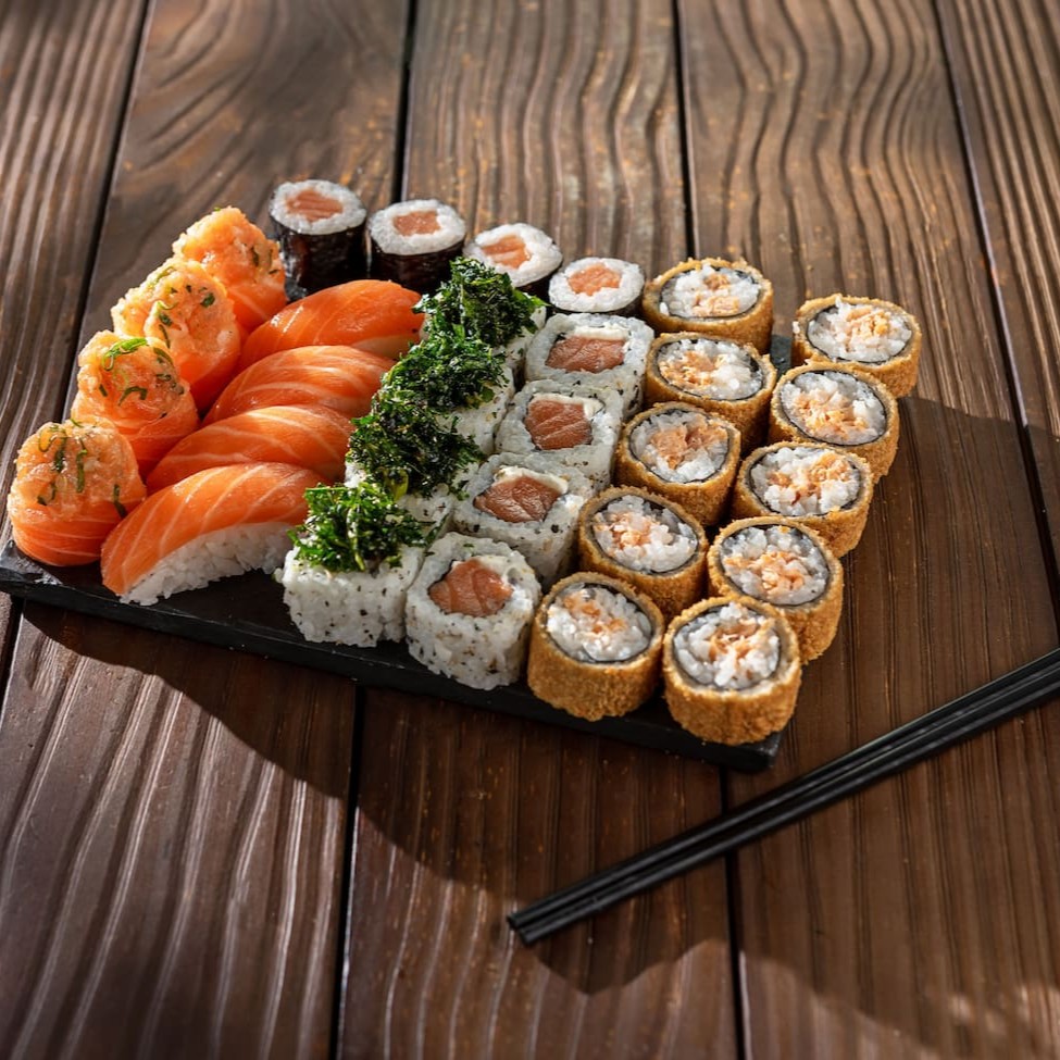 Combo Salmão e Diversidade: - 4 Sashimi de Salmão - 4 Uramaki Skin - 4 Uramaki de Salmão - 4 Uramaki Filadélfia - 4 Hossomaki de Kani - 4 Nigiri de Salmão - 4 Hossomaki de Salmão - 4 Hossomaki de Pepino - 8 Hot Roll