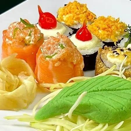 Arroz Japones,Manga,Sunomono,Tomate cereja,Salmao cru,Creme chess
