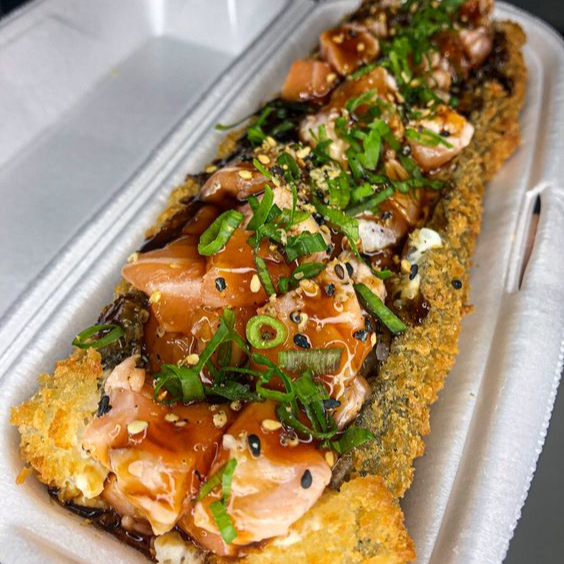 Arroz japones,Sunomono,,Amendoin, Couve Crispy batata Crispy,Salmao grelado,Creme chesse