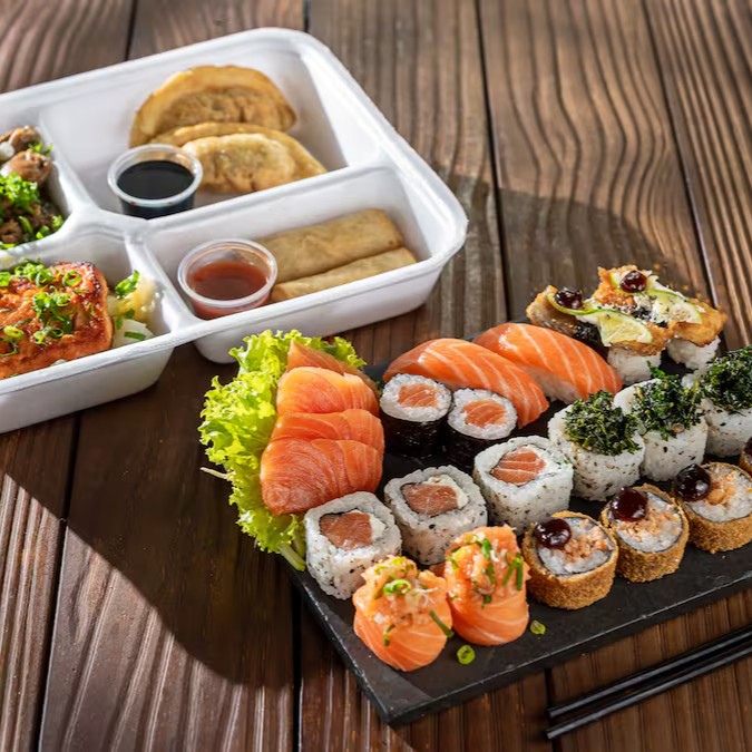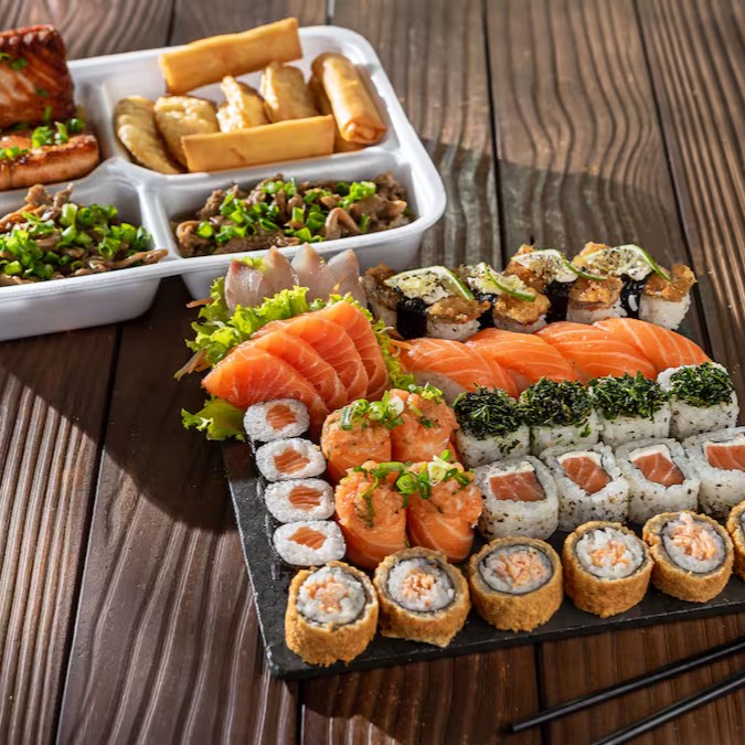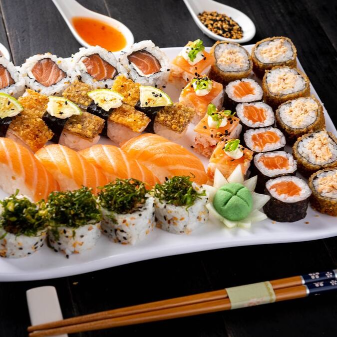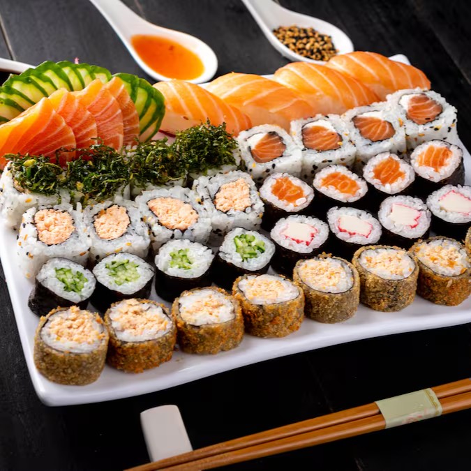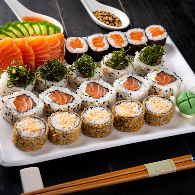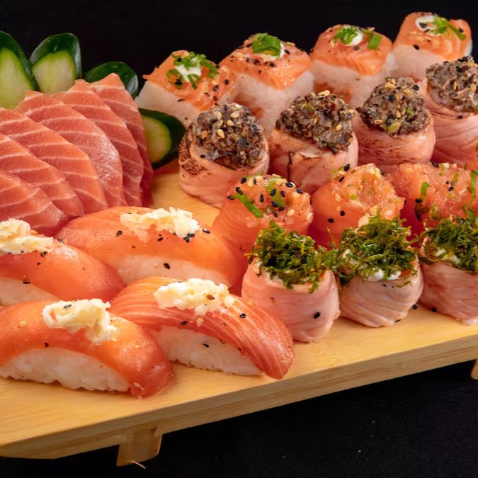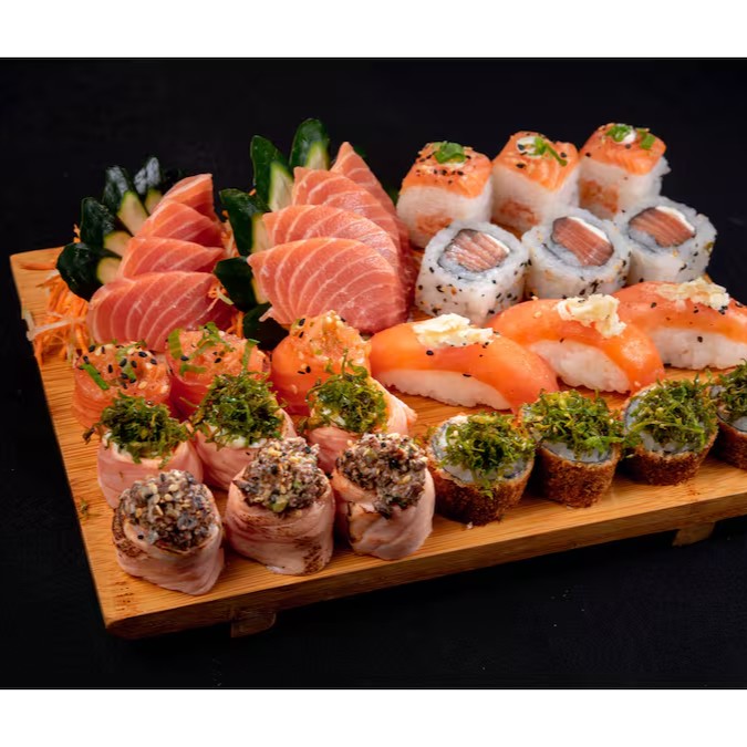 4 sashimi de salmão/ 4 nigiri salmão/ 4 uramake skin/4 shakemaki/ 4 uramake salmão/ 4 uramaki philadelfia/ 8 hot roll/ 4 kapamaki/ 4 kanimaki.