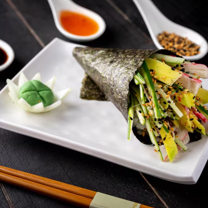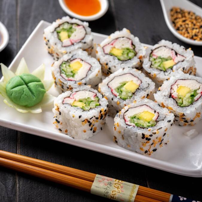 Enrolado de arroz, gergilim, alga marinha, recheio de manga, pepino e kani.