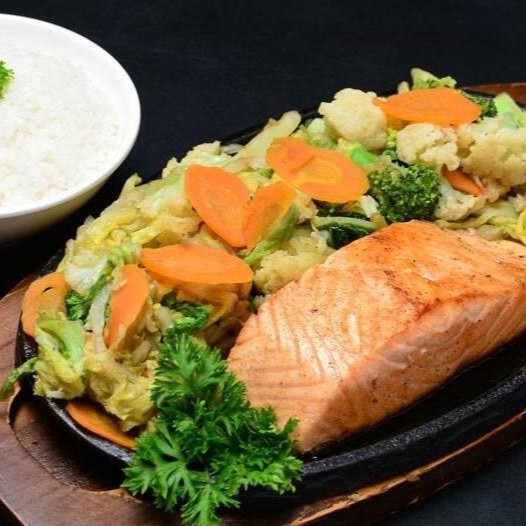 200g Salmão grelhado acompanha :legumes refogados e gorran.
