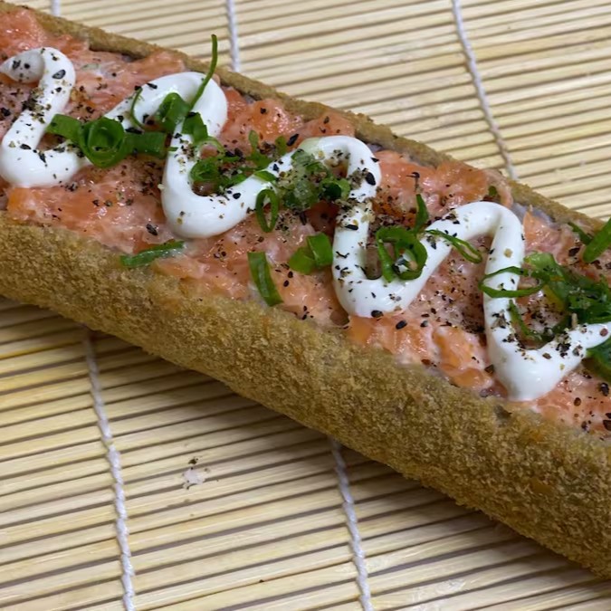 Enrolado crocante com salmão batido cream cheese e cebolinha.