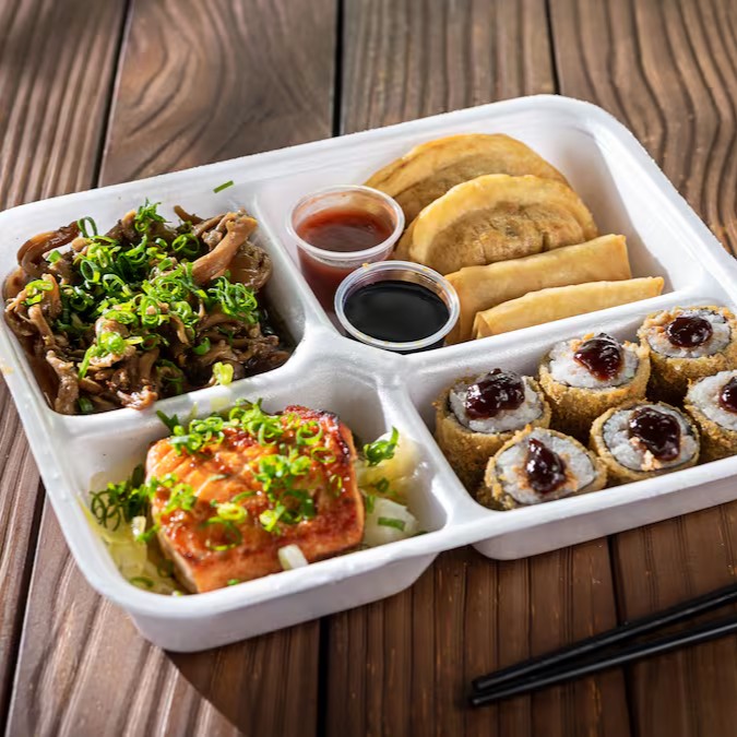 Nosso delicioso combo especial para o inverno com 1 shimeji + 1 salmão grelhado + 2 harumakis de queijo + 2 guiosa + 6 hot holl