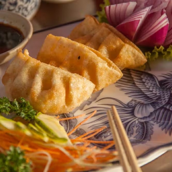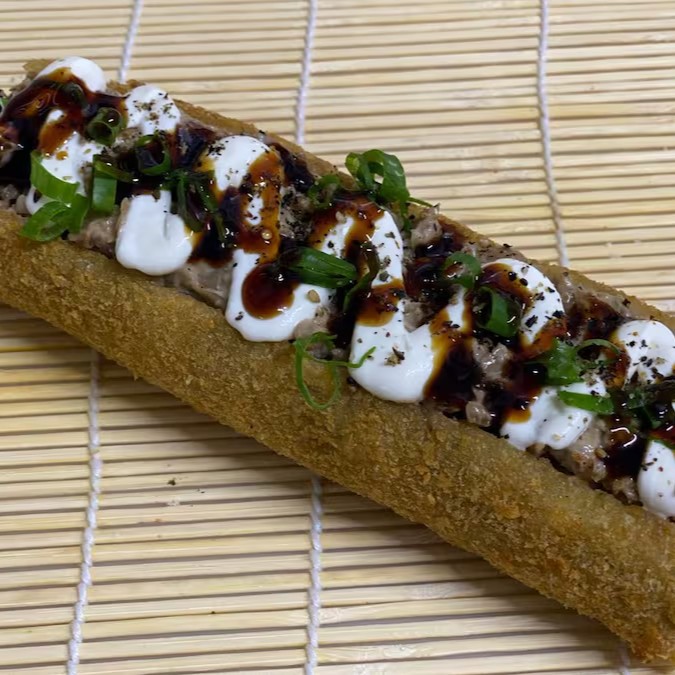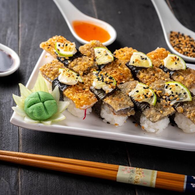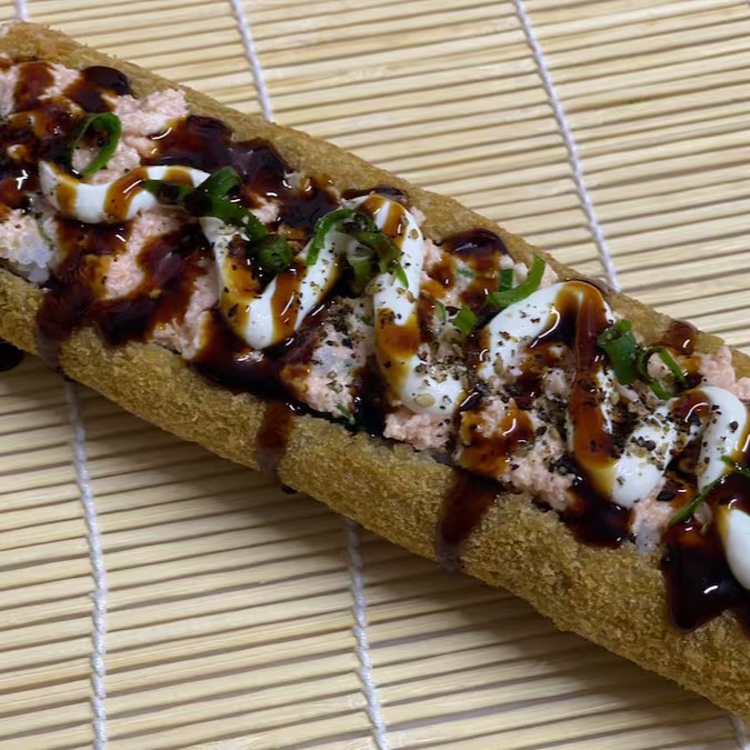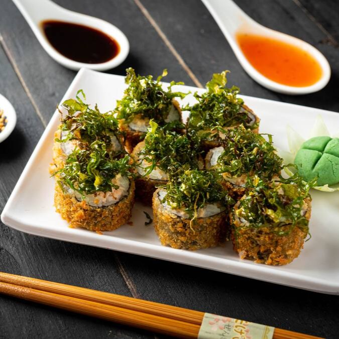 Enrolado em uma massa feita com farinha panco, recheio de salmão grelhado, molho tarê e couve frito.