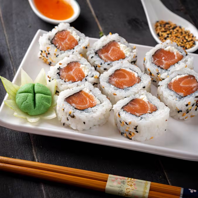 Enrolado de arroz, gergilim, alga marinha, recheio de salmão com cream cheese.