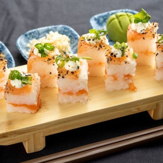 Porção feita com duas camadas de arroz e duas camadas de salmão, recheio de cebolinha creme chesse e gergelim.