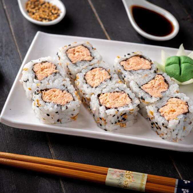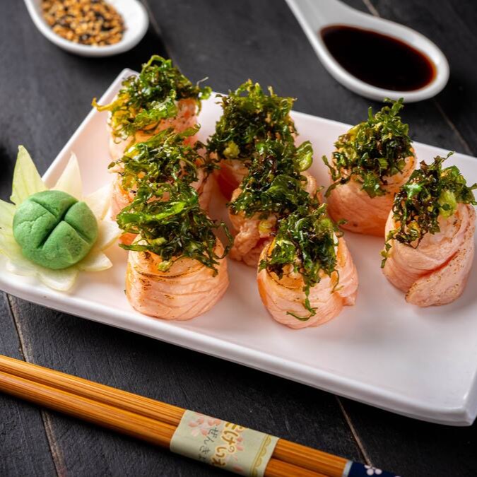 Enrolado de salmão e arroz maçaricado, recheio de cream cheese, couve e molho tarê.