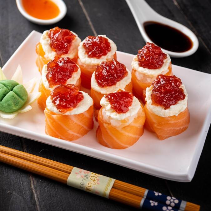 Enrolado de salmão e arroz, recheio de cream cheese e com uma deliciosa geleia de morango.