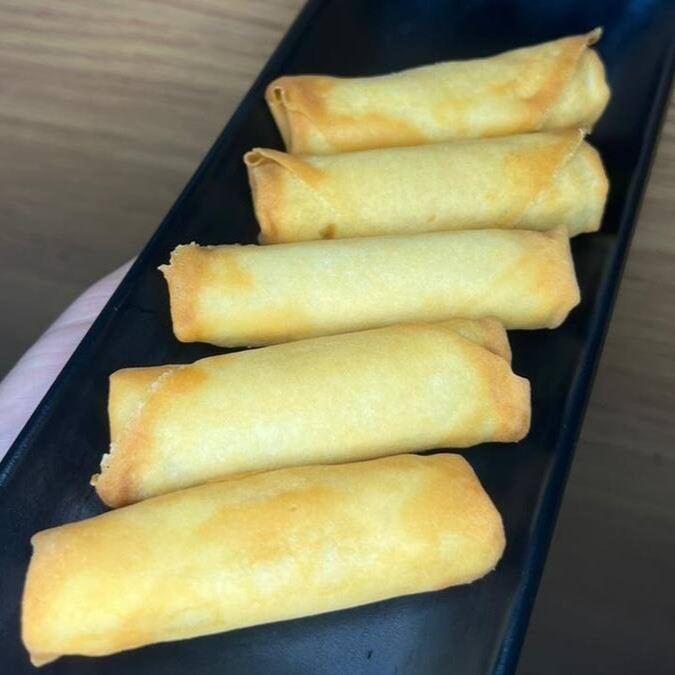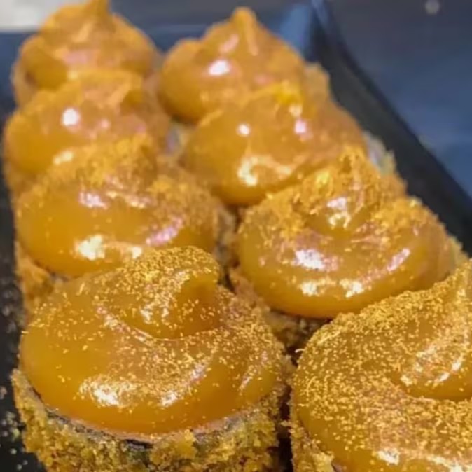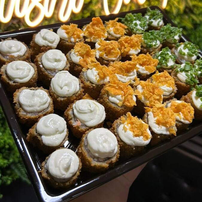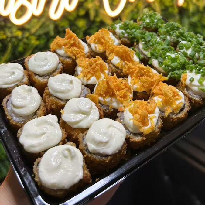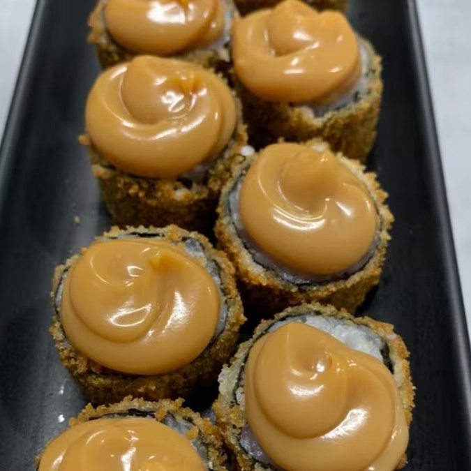 Porção de 8 unidades de sushi frito recheado com banana e cobertura de doce de leite,