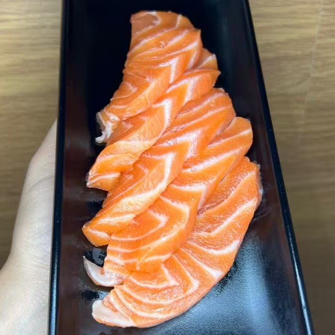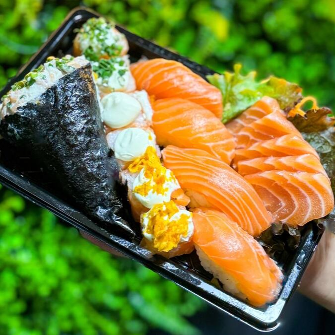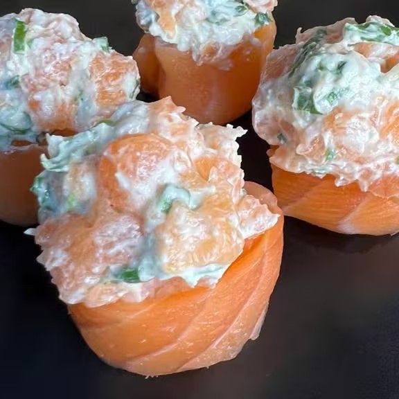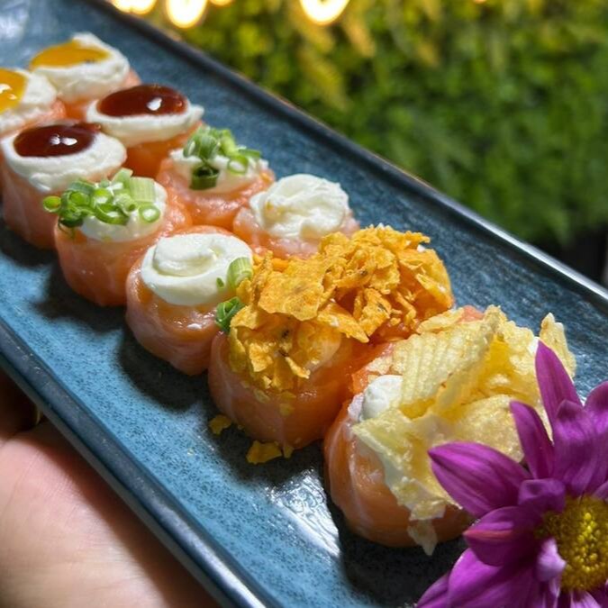 Porção de arroz envolta por uma lâmina de salmão, finalizada com salmão batido com cream chesse e cebolinha.