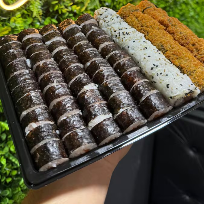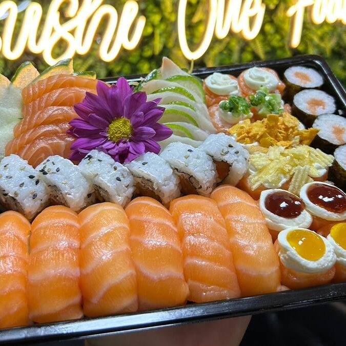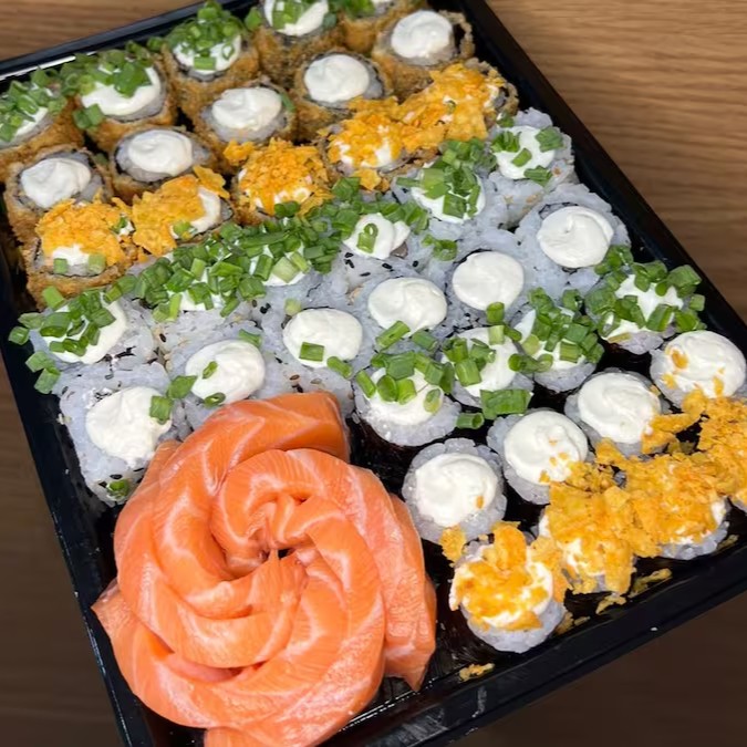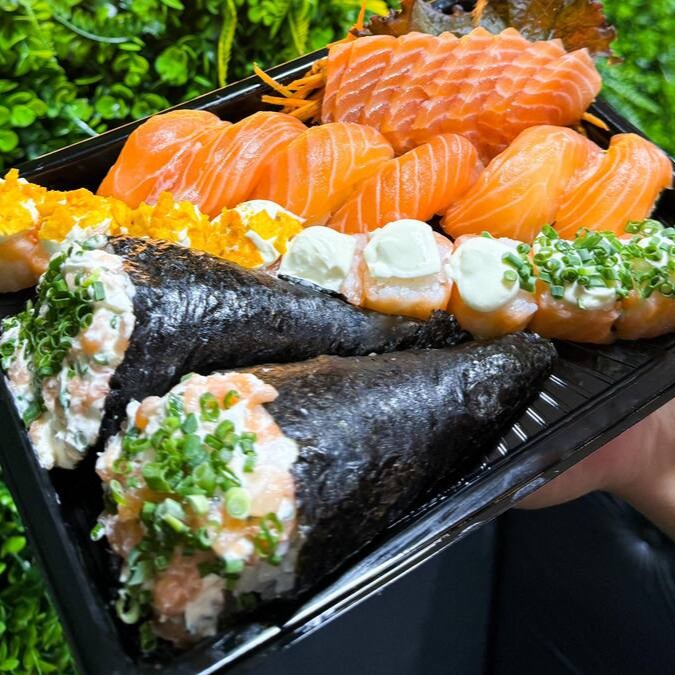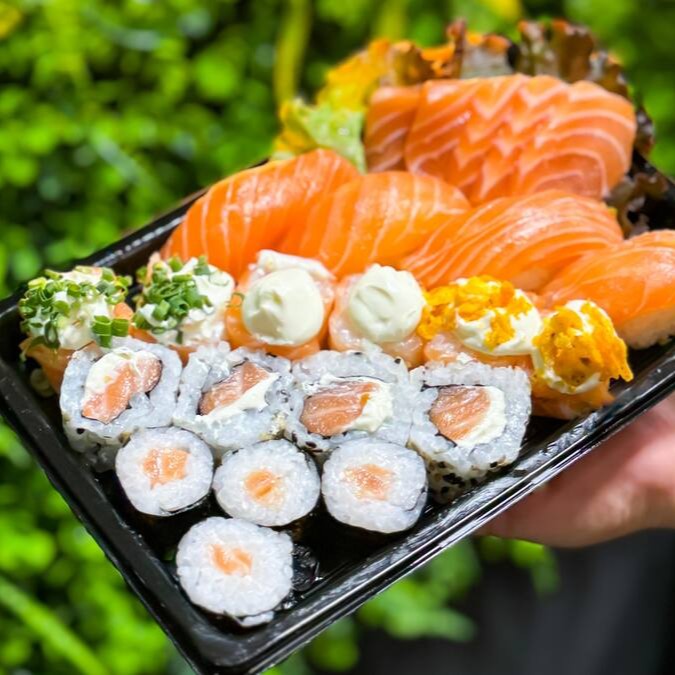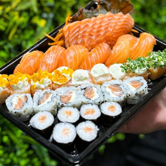 Acompanha 48 peças + kit molho (2 sachês de shoyu, 2 sachês de tarê e 2 hashis)