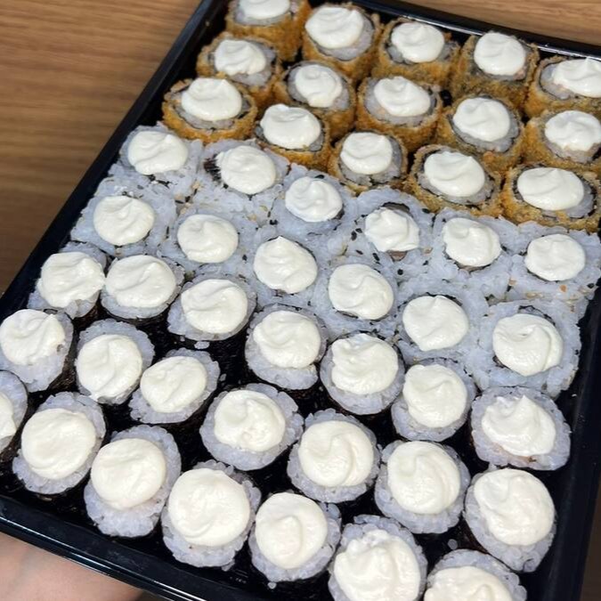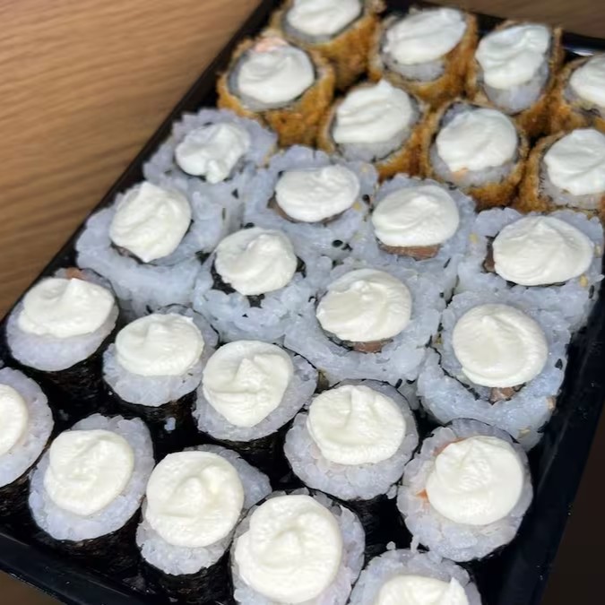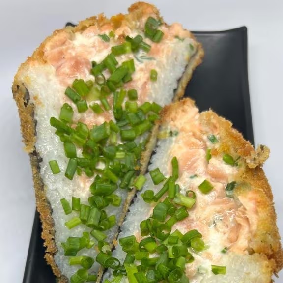 Porção de arroz envolta por uma lâmina de salmão, finalizada com salmão salmão batido com cream chesse e cebolinha.