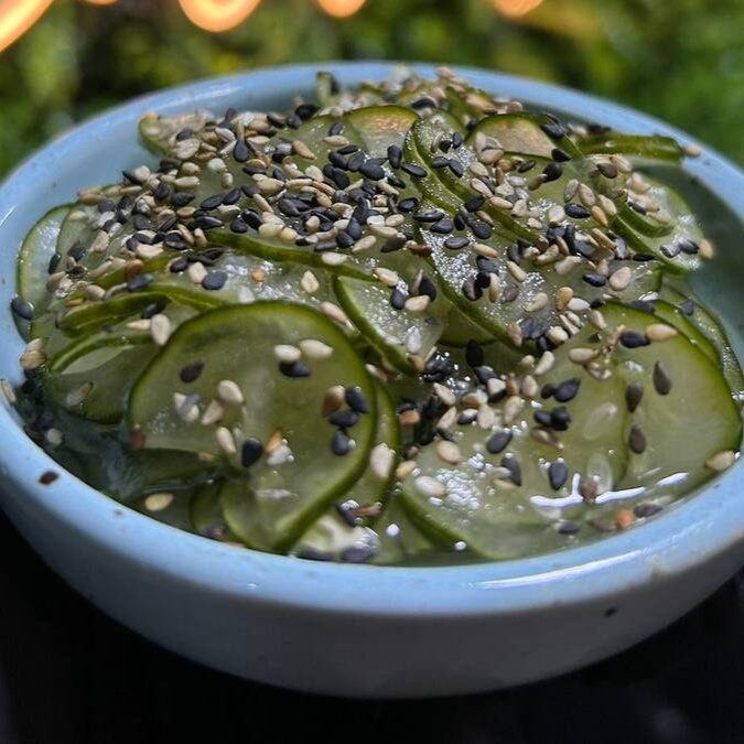 Pepino agridoce. Porção de pepino em molho agridoce, com base de vinagre de arroz e açúcar, finalizado com gergelim.