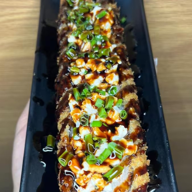 Rolo de hot roll recheado com salmão cru, cebolinha, creamchese, e finalizado com tarê