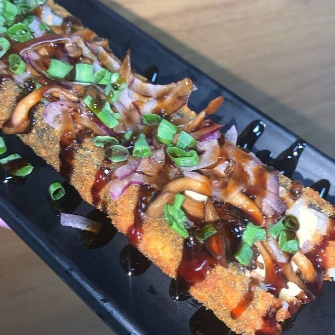 Rolo de hot roll recheado com shimeji, cebola roxa, cebolinha, creamchese, e tarê