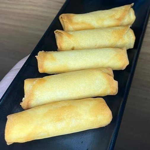 Porção de 8 unidades de sushi frito recheado com banana e cobertura de doce de leite e canela