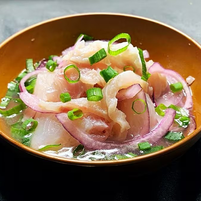 Peixe Saint Peter fresco, marinado em molho de limão, com finas fatias de cebola roxa e cebolinha.
